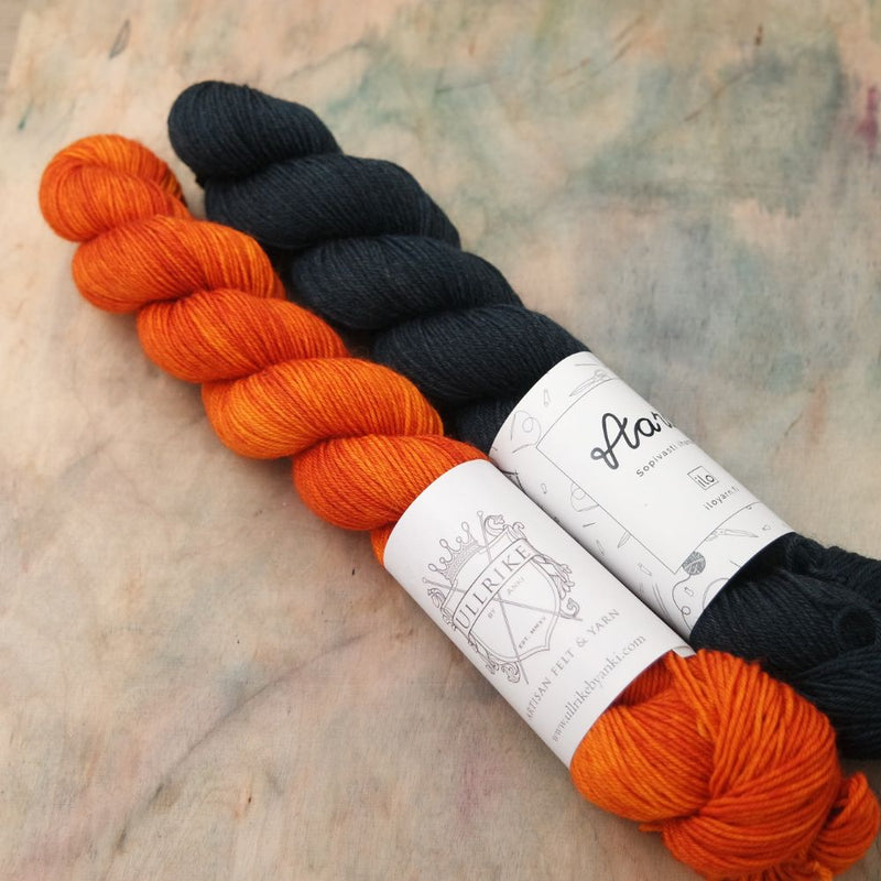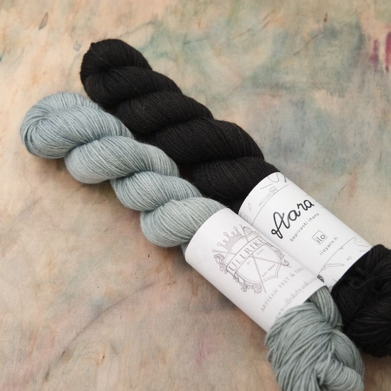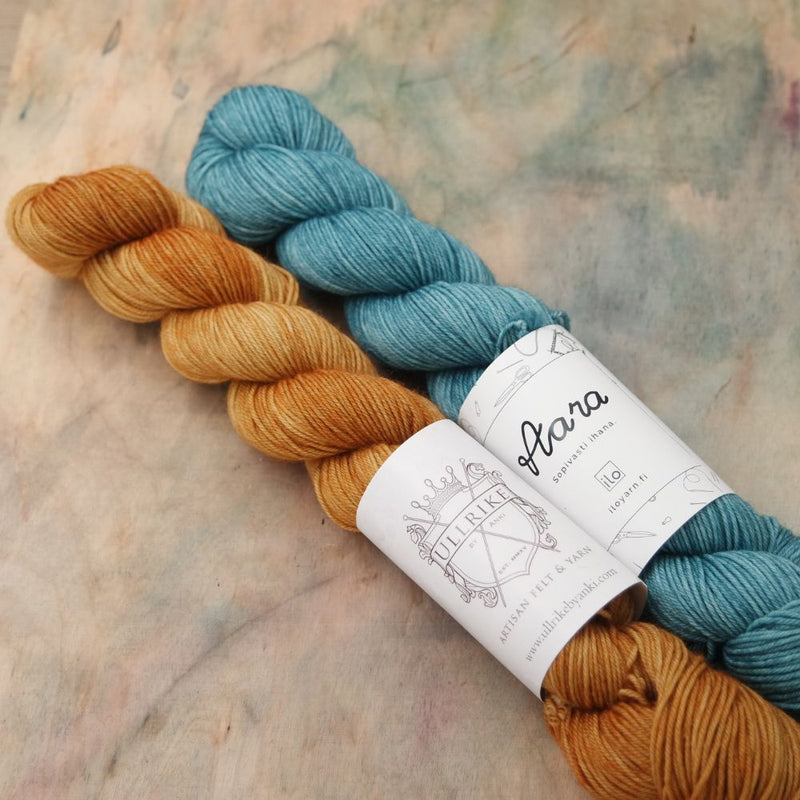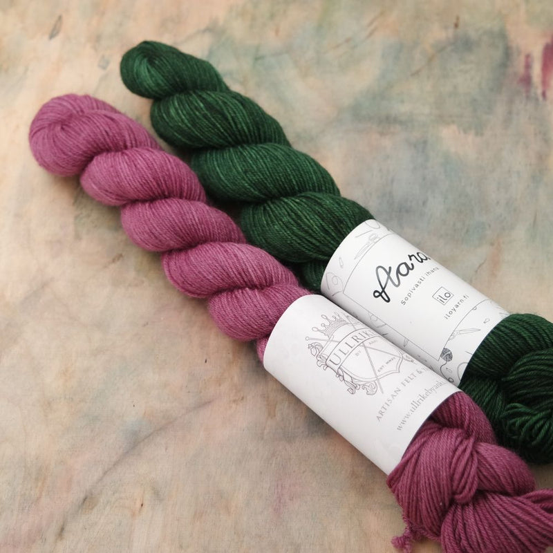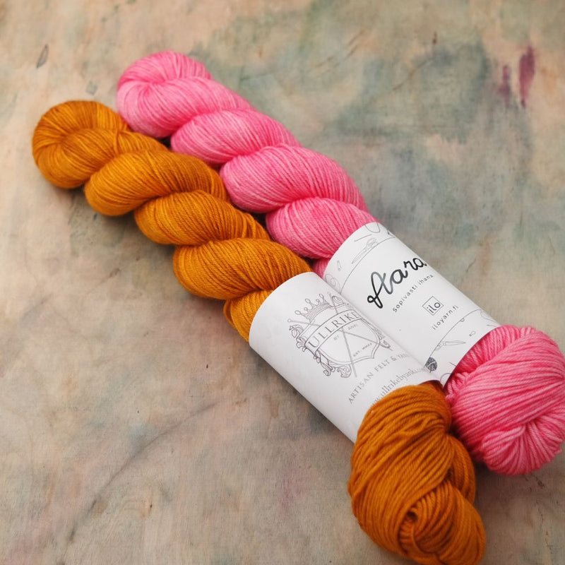 Alkuperäinen Pino sukkalankasetti sisältää 50 gramman vyyhdin Aaran Mieliä sävyssä Unikko ja 50 gramman vyyhdin Ullrike by Ankin Merino Sock-lankaa sävyssä Dunes ja nyt värjäsimme sen rinnalle viisi uutta väriparia!